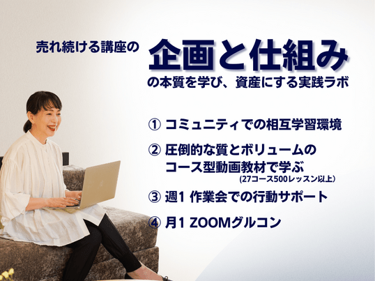 単発講座を卒業!売れる企画と仕組みで講座を資産へ。グループコンサルと充実の量と質を誇る動画教材で確実に前進するオンライン講師のための実践ラボ
