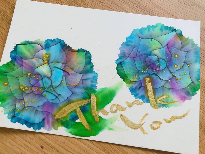 夢ロゴアート。水と専用はがきの作り出すグラデーションが素敵な仕上がり。いろんな技法を学んで、毎回、ワクワクする講座です。