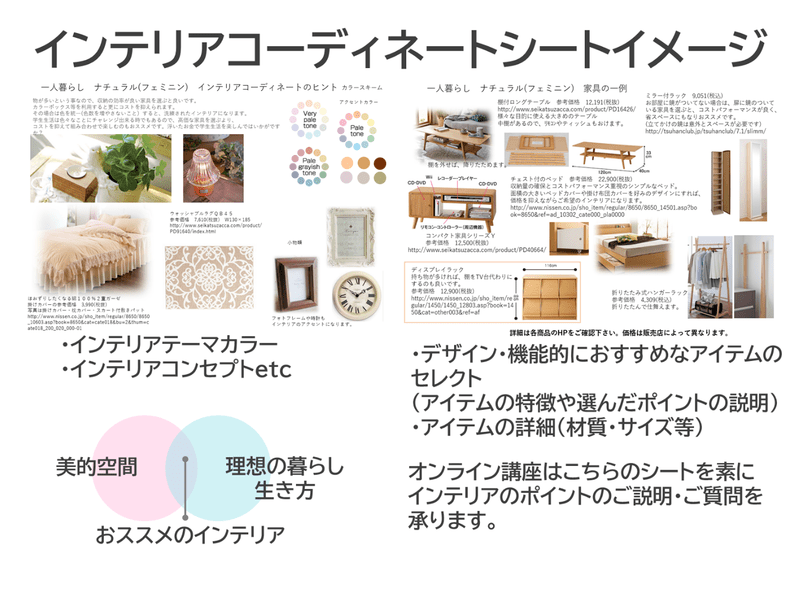 好みや理想の暮らし方をお聞きし、おススメのインテリアコーデをご提案。これを素にインテリアを検討することで迷い・後悔・コストの削減ができます