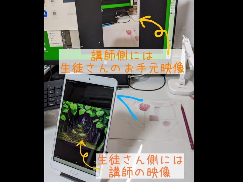 ※受講者さまの描かれた絵は、都度カメラに絵をかざして見せていただくか、もしくは写真に撮ってお送りいただき、アドバイスを行います。